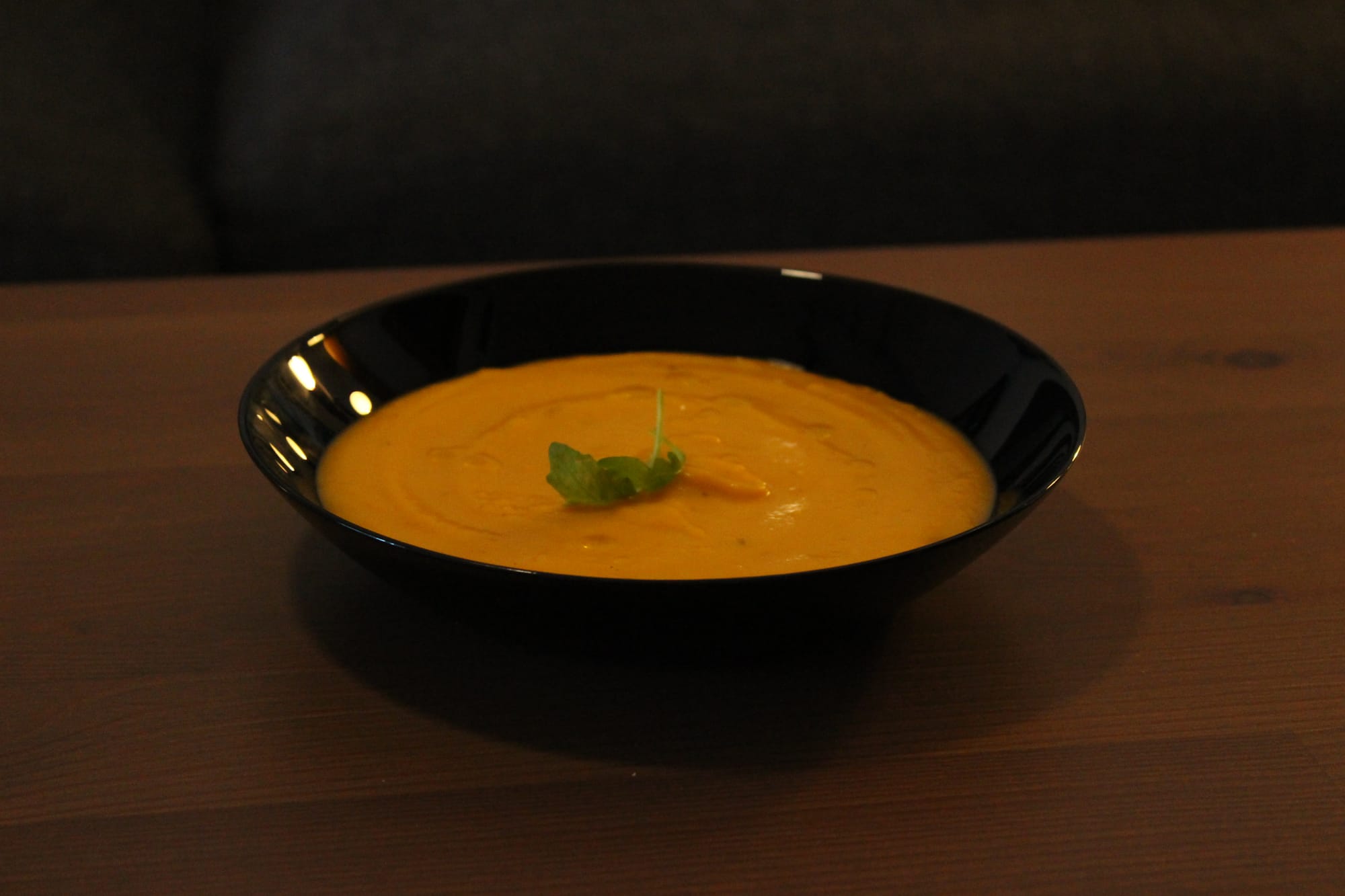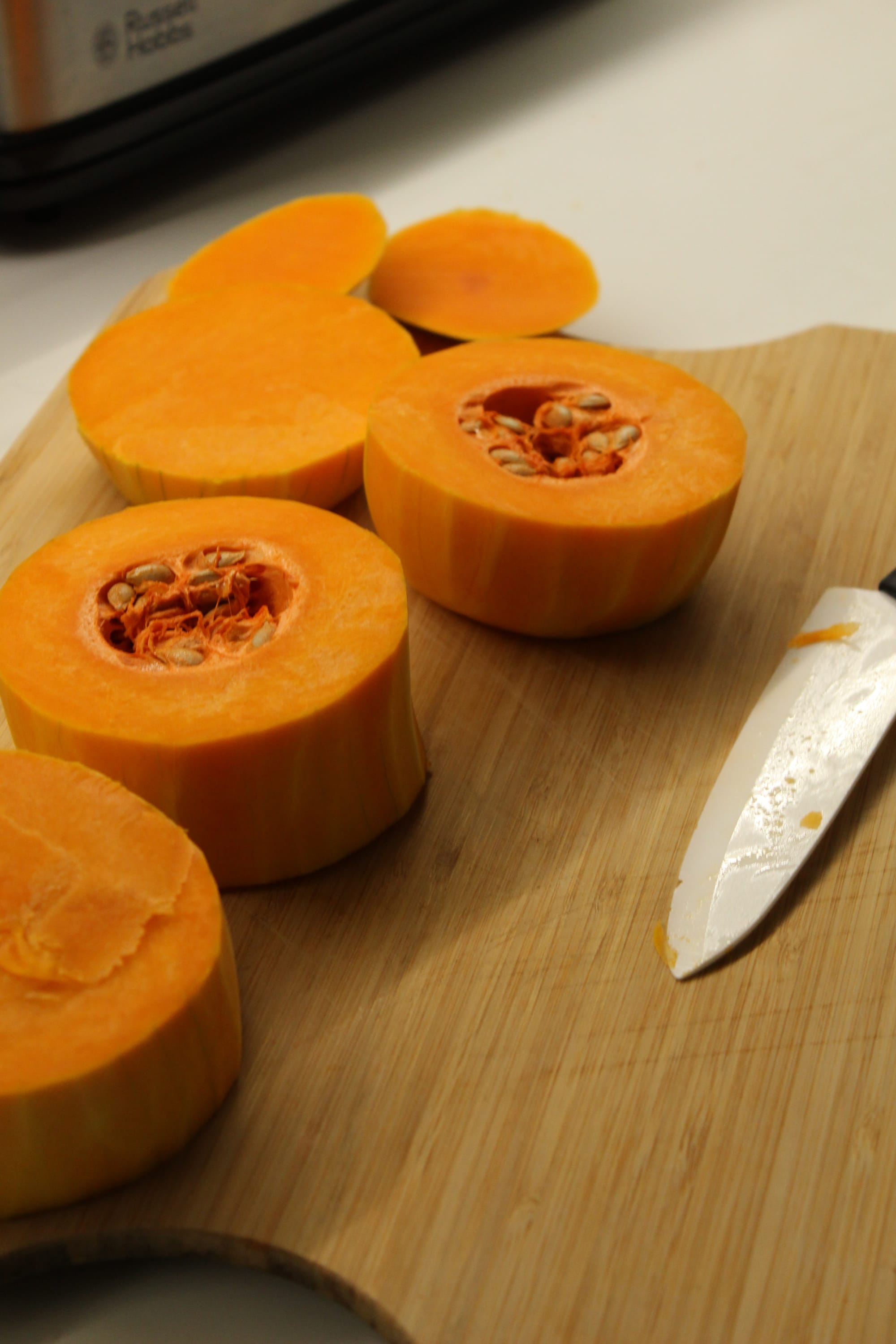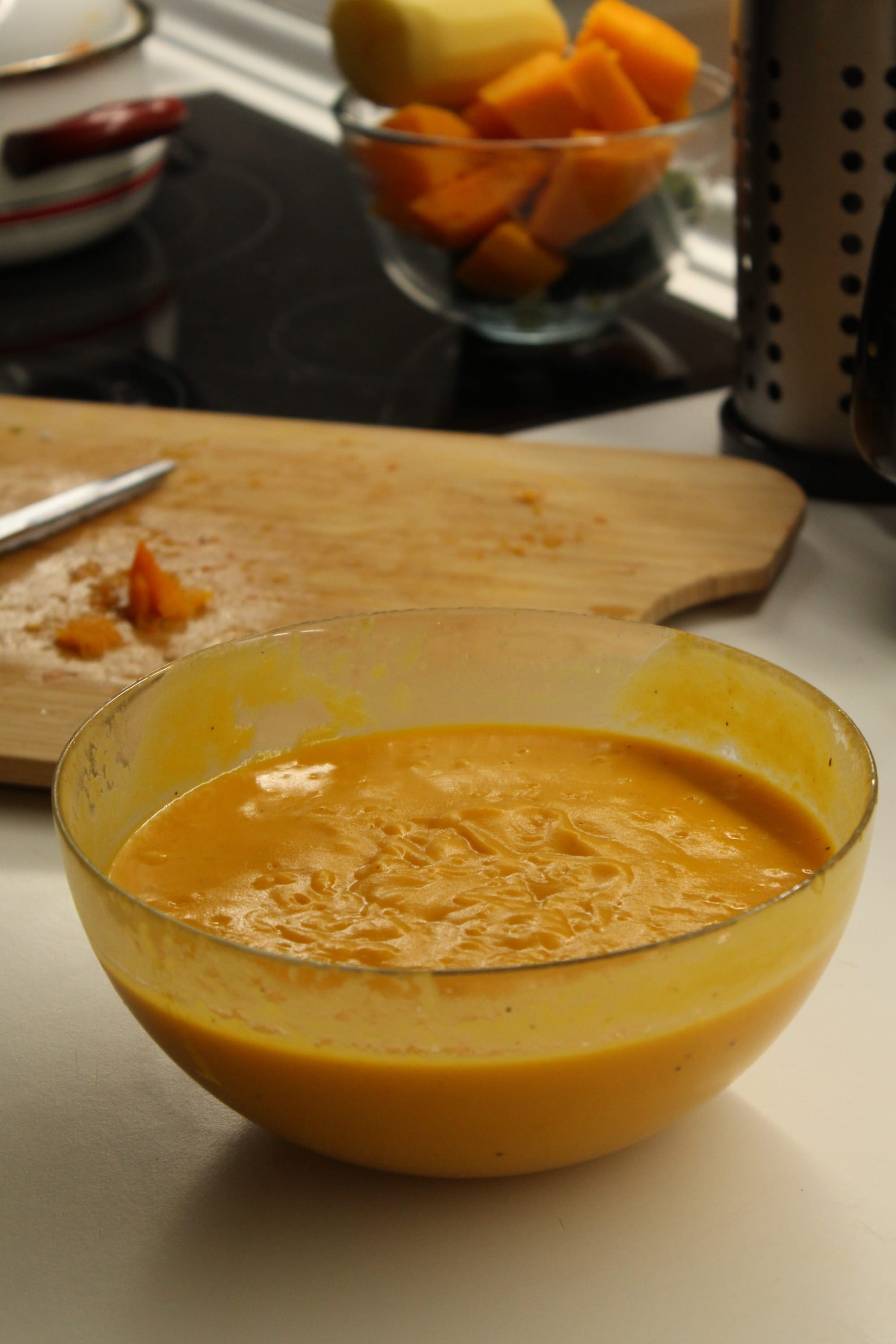 Hierve la calabaza en trozos, la zanahoria, el calabacín y las patatas. Puedes triturarlas primero, o meterlas directamente en la batidora. Añade el aceite, la sal y el agua y, opcionalmente, nuez moscada y curry. Estos le dan un toque muy sabroso. Bate bien, puedes añadir más o menos agua hasta que la textura quede cremosa. Deja que se enfríe y para conservarla, puede guardarse tapada en el frigorífico.