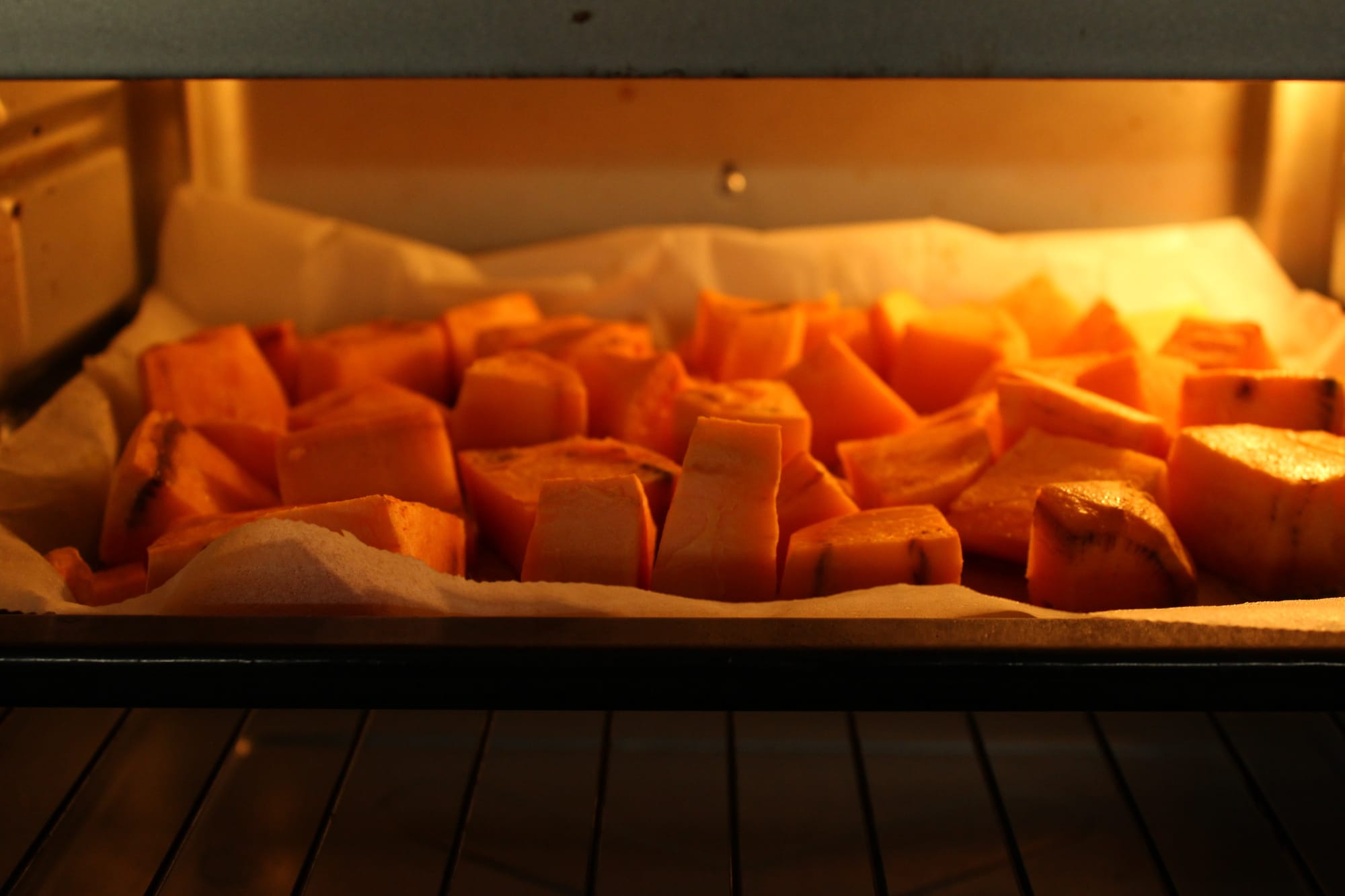 Corta el boniato en trozos grandes, y cocínalo como quieras: asados, salteados o al vapor. Puedes asarlos en el horno, en una sartén o en el microondas si tienes una lekué. En el horno es muy fácil y queda muy rico: extiende los trozos sobre la bandeja y hornea hasta que estén blanditos. Déjalos que se enfríen un poco.