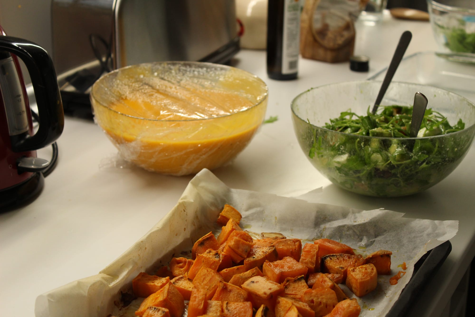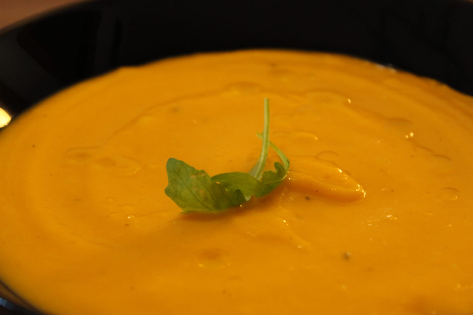 Crema de calabaza, ensalada de boniato y hojaldre de vegañesa con verduras
