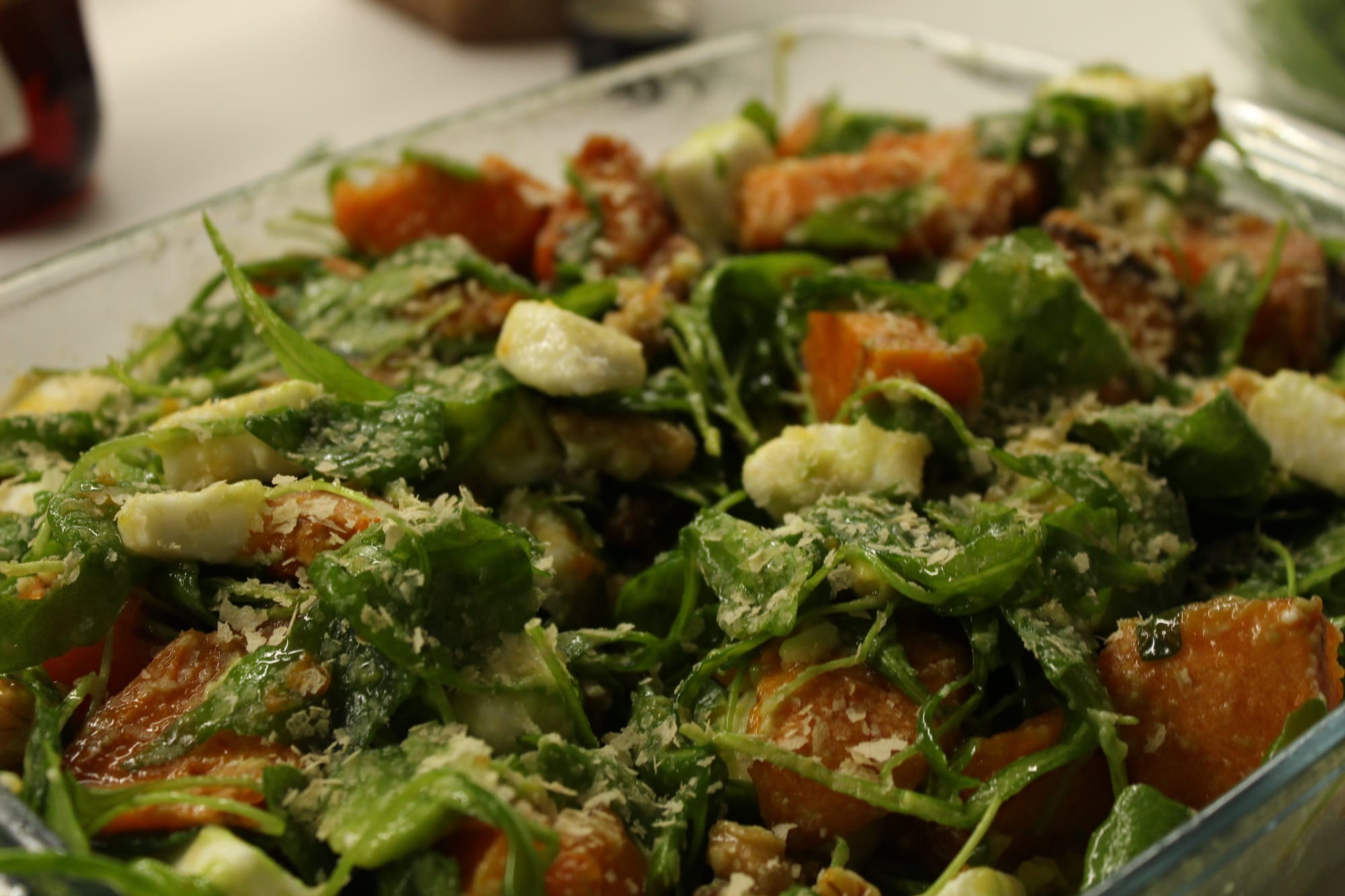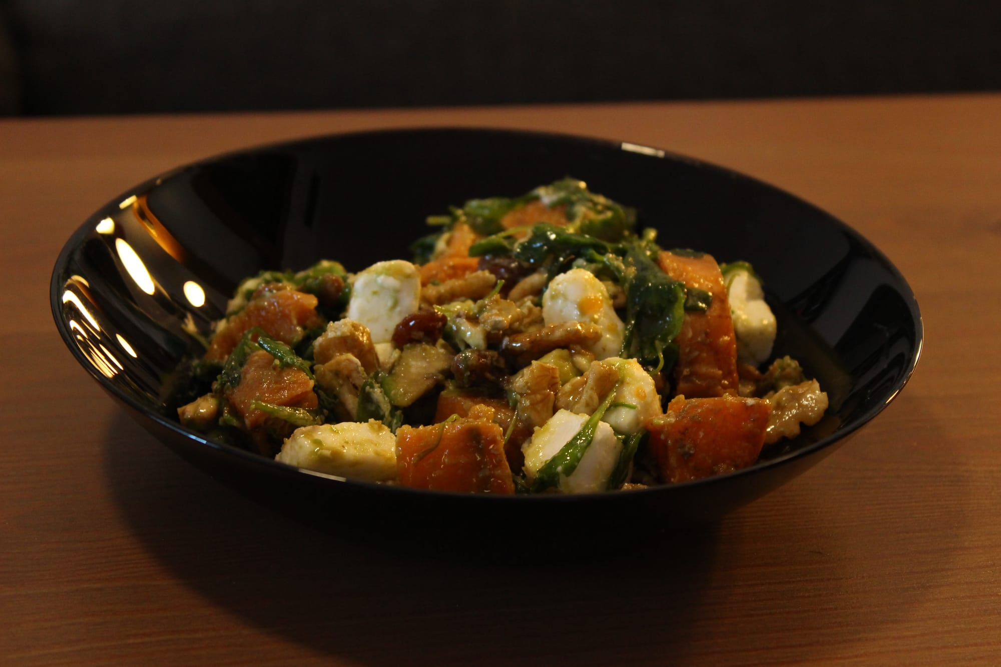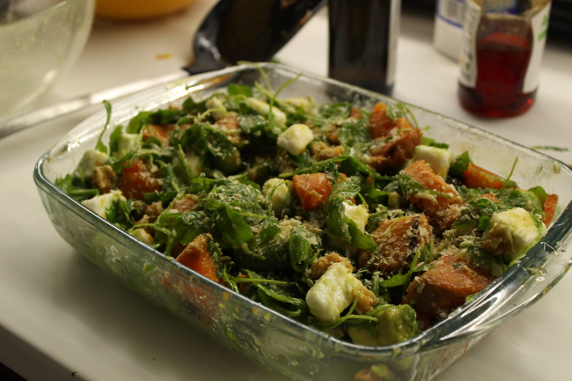 Corta el aguacate en trozos y el queso griego vegano en daditos. Parte las nueces en trozos más pequeños. Pon en un bol la rúcula, el aguacate, el queso griego vegano, las nueces y las pasas. Ve añadiendo poco a poco cuatro cucharadas de aceite de oliva y remueve bien. Después, añade una cucharada grande de sirope de agave y haz lo mismo. Añade los trozos de boniato ya fríos, otra cucharada de aceite, un poco de sal y remueve bien. A mí me gusta ponerle un poco de levadura de cerveza (tengo una ligera adicción)