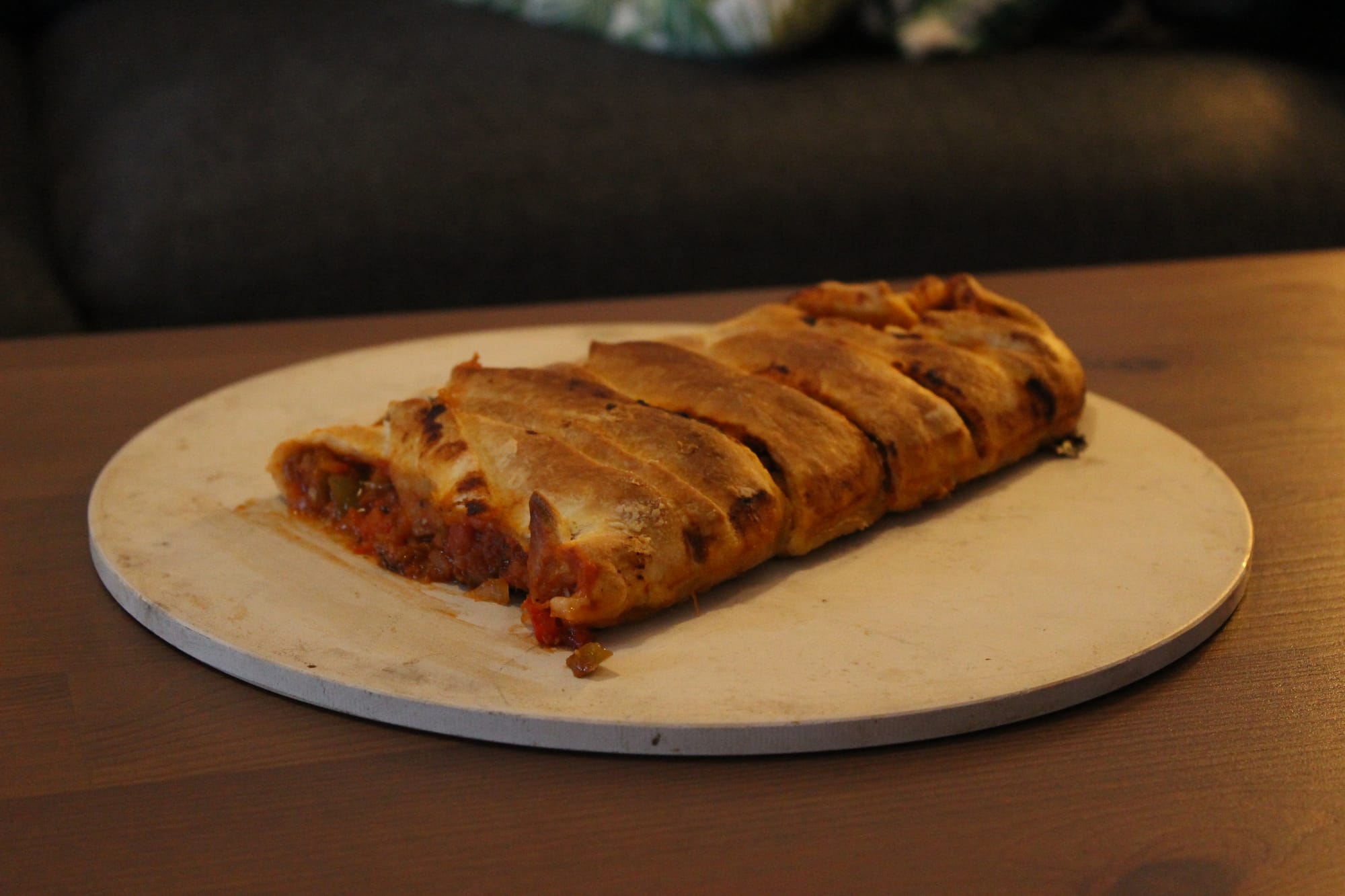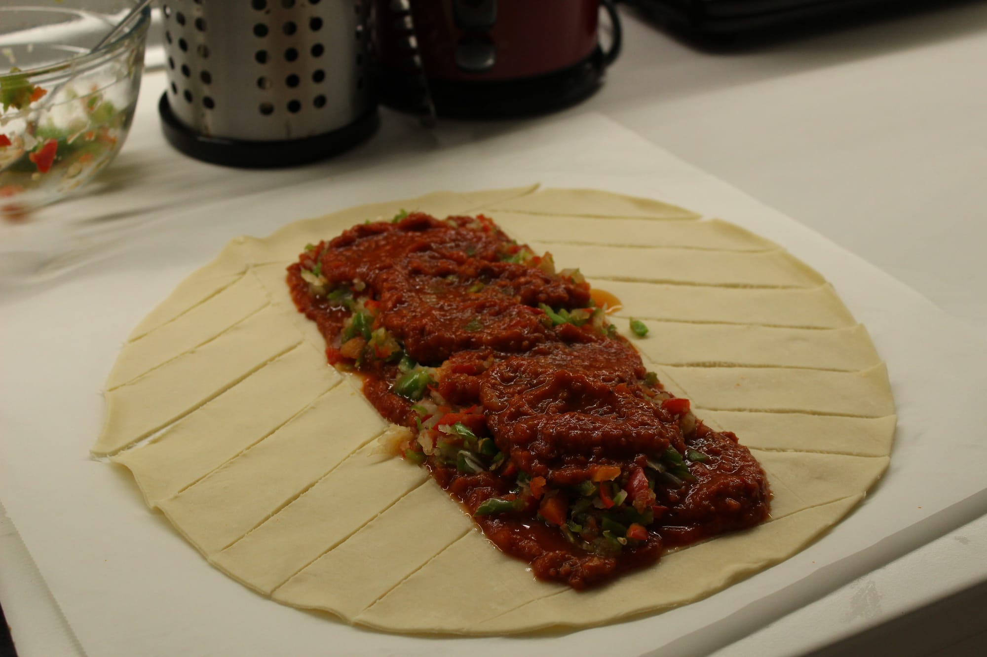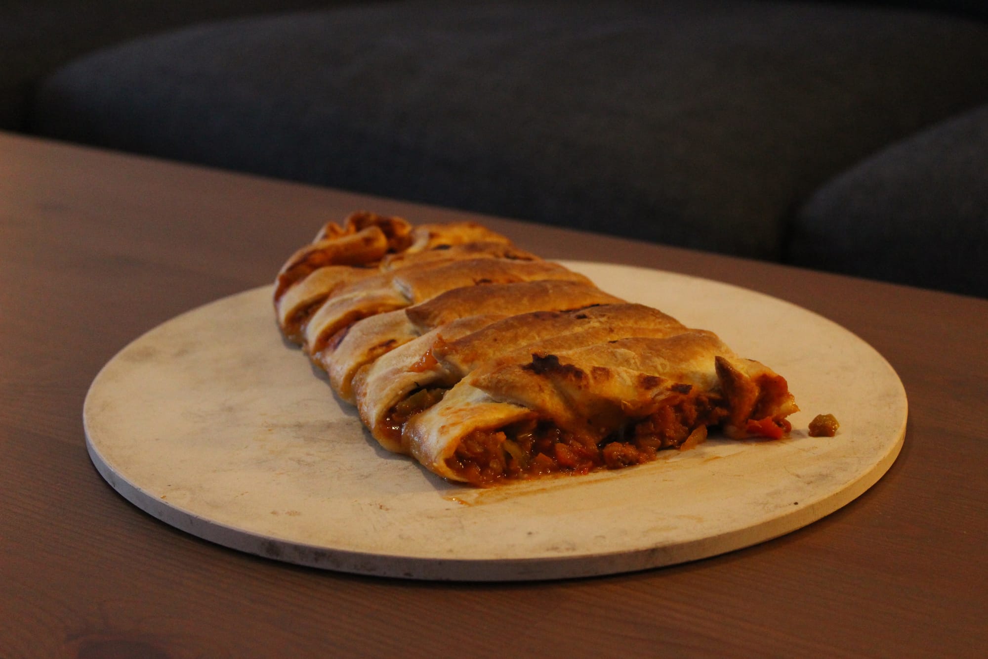 Corta la cebolla y el pimiento en trocitos pequeños, puedes usar una trituradora. Extiende la masa de hojaldre y aplica el dibujo que quieras, en mi caso: divido en 3 partes, siendo la central más grande, que actuará como base, y los extremos cortados en tiras que luego irán trenzadas. En la base, extiende primero una capa de vegañesa. Sobre esta, la cebolla y el pimiento. Añade otra capa de vegañesa y extiende bien. Cierra el hojaldre. Dora por encima pintando el hojaldre con leche de soja.