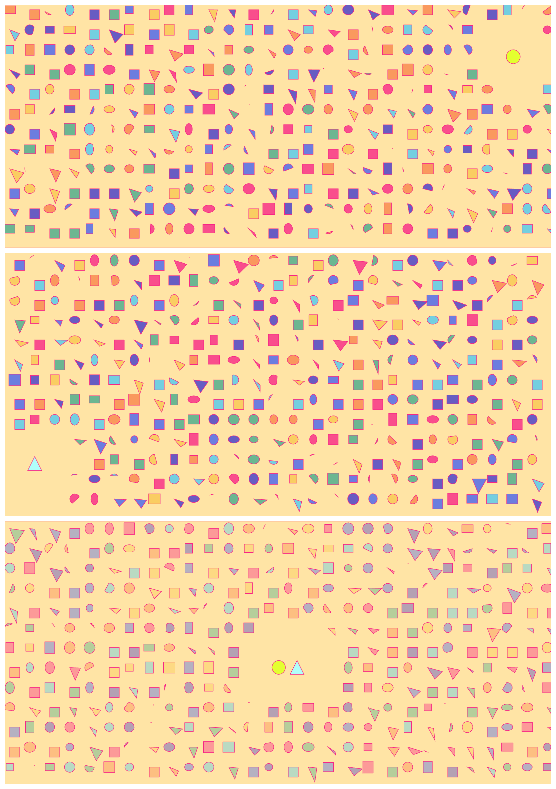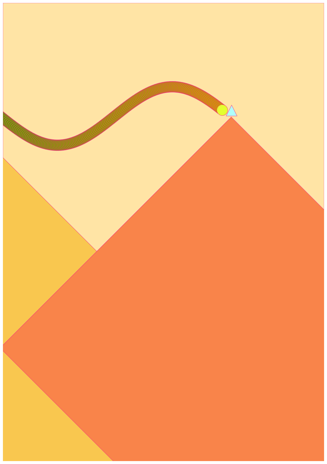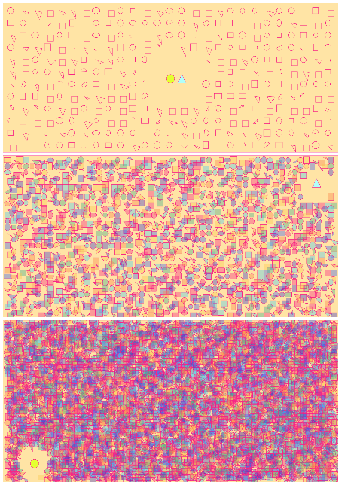 Estos días he ido elaborando poco a poco este cuento en 2D titulado "la historia de amor del círculo y el triángulo". El origen de la primera viñeta surgió hace ya un par de años, cuando se me ocurrió representar la soledad utilizando arte procedural: quería representar la sensación de estar rodeada de gente y, aun así, sentir una enorme soledad en el pecho. En aquel momento, todo lo que dibujé fueron círculos, no sabía hacer otra cosa. Esta historia de amor es la transformación de esa idea original en cuento: ¿cómo representar a dos personas que se sienten solas, que de pronto se encuentran y se dan cuenta de que están hechas la una para la otra, con arte procedural? Sí, el cliché del amor romántico, tan lleno de aristas, tan obtuso.